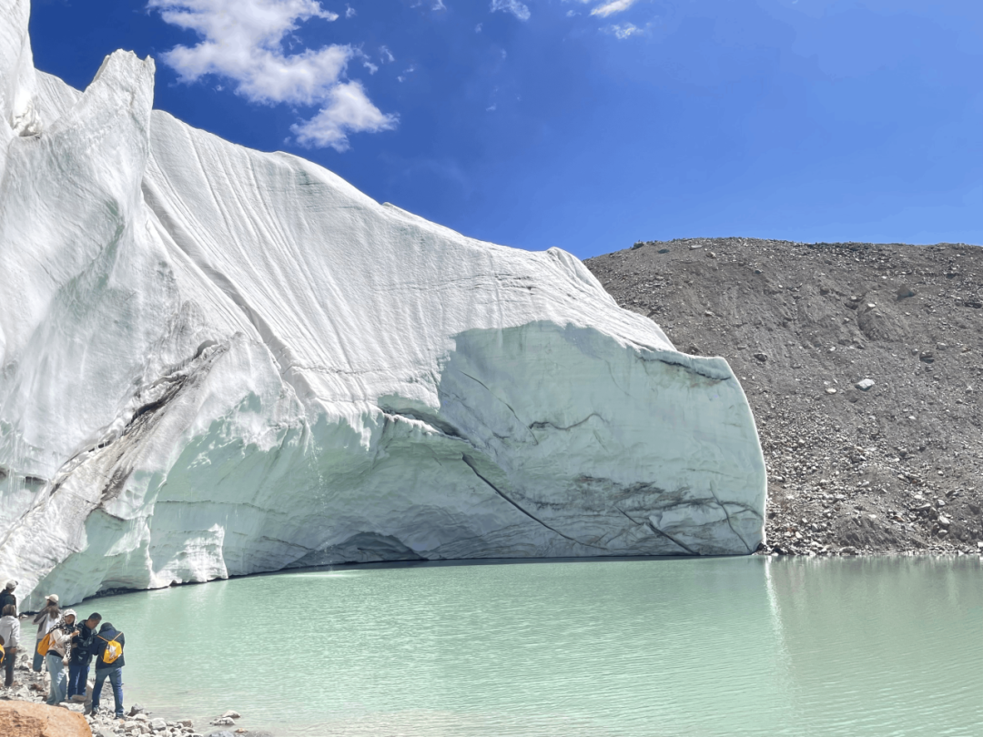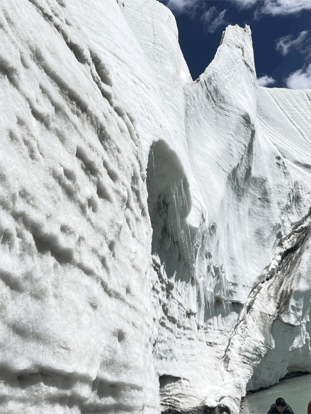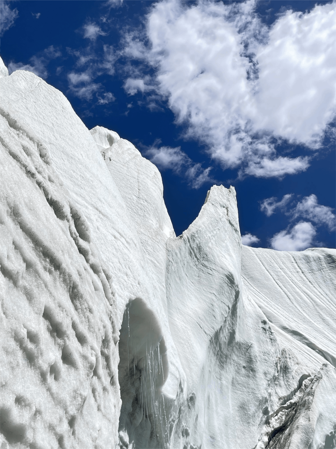 从景区摆渡车下来,步行最后一公里上山,在缺氧环境下会感到体力快速消耗。但随着一片伟岸纯净的冰川景观在眼前展开,呼吸到一口冰蓝的空气,再走近抚摸存在了成千上万年的冰丘、冰舌,世界似乎只剩下极致的蓝与白,连带心里的杂念和烦恼也一同冻住、清空了。