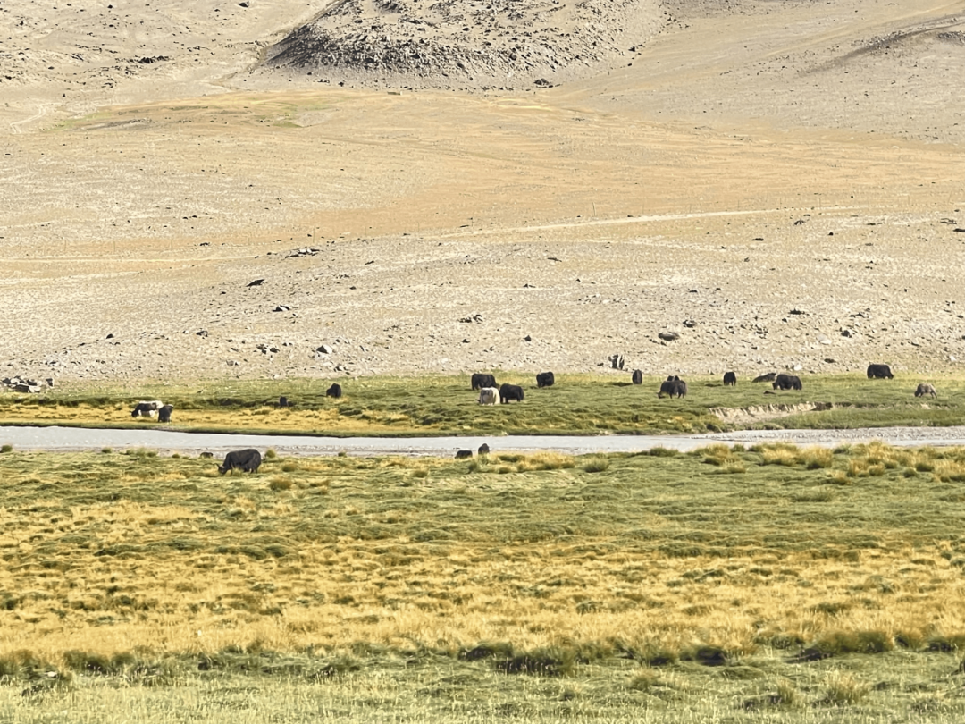 次日早上,沿314国道往塔什库尔干县方向开,全程大约300公里,景点都在国道两旁。到达城市边缘时,缓缓铺开的风景大片令人盛情难却。从村庄过渡到戈壁滩、湖水、森林草甸,大片红棕、赭黄、碳灰色的山体随机切换,牛羊悠闲地吃草憩息,远处的山尖若隐若现,山顶的白雪化作溪水滋润着石滩,磅礴又温柔。