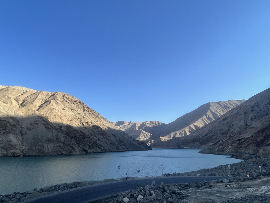 数千年来,干燥的风日复一日雕刻着山的皱褶、湖的肌理,被自然提纯过的墨蓝色湖面汩汩流动,视线的尽头是凡人望不穿的高原尺度。回程时的某个转弯,赫然出现的“帕米尔之眼”,则是来自万年高原压倒式的气魄,浑然天成。