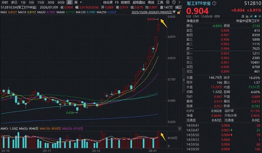 军工ETF华宝(512810)高开高走,盘中一度暴涨超5.5%,场内价格收涨3.91%,连续4日刷新历史纪录。全天成交1.32亿元,创近1个月新高!