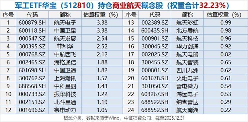 据统计红和古,军工ETF华宝(512810)标的指数中证军工覆盖24只商业航天概念股,权重合计超32%。