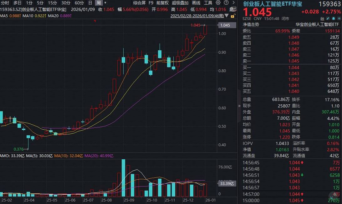 热门ETF方面,流动性突出的创业板人工智能ETF(159363)场内收涨2.75%,再创上市新高,放量成交7亿元!单周复盘看,创业板人工智能ETF(159363)周线斩获七连阳,标的指数区间累涨29.32%。(统计区间2025.11.28-2026.1.9)