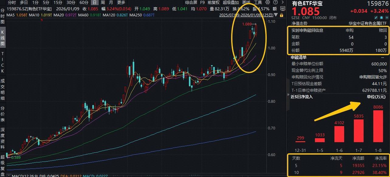 有色金属等顺周期资产继续狂飙,资金连续猛攻!板块热门ETF——有色ETF华宝(159876)场内价格收涨3.24%再创历史新高,全天获资金净申购5760万份,此前5日已累计吸金1.94亿元。化工ETF(516020)全天溢价交易,或有大额资金介入,此前五日资金已合计加码4.8亿元。