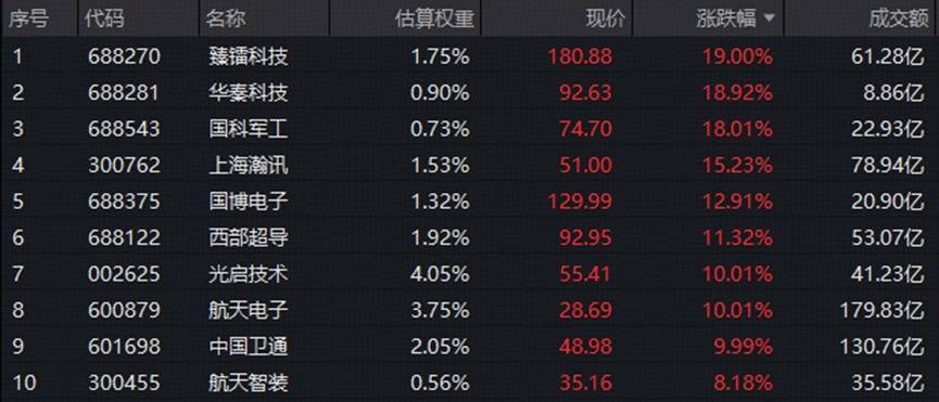 军工,炸裂上涨!军工ETF华宝(512810)80只成份股中73股收涨,8股涨超10%,臻镭科技尾盘触及20CM创历史新高,光启技术首板,航天电子、中国卫通6天4板续创新高,此外中国卫星、国博电子、西部超导等9股均创历史新高。