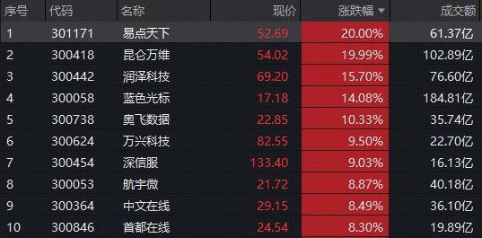 AI应用大爆发,创业板人工智能再创新高,成份股大面积上涨!其中,易点天下20CM涨停创新高,昆仑万维20CM封板,润泽科技、蓝色光标、奥飞数据均大涨超10%,万兴科技、深信服、航宇微、中文在线、首都在线、汉得信息等多股跟涨超8%。