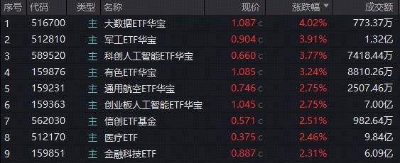 盘面上,热门主线题材——军工、航空继续走强,航天电子、中国卫通6天4板续创新高,军工ETF华宝(512810)盘中一度暴涨超5.5%,场内连续4日刷新历史纪录,周线斩获七连阳;场内热门通用航空ETF华宝(159231)再涨2.75%同样连创新高,资金单日净申购2100万份。